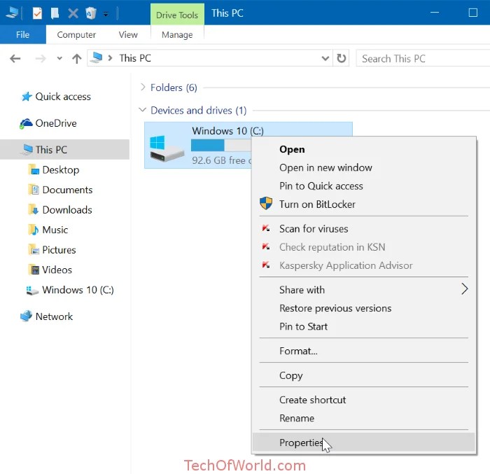 Step 1: Open up This PC, right-click on the drive where Windows 10 is installed and then click Properties.