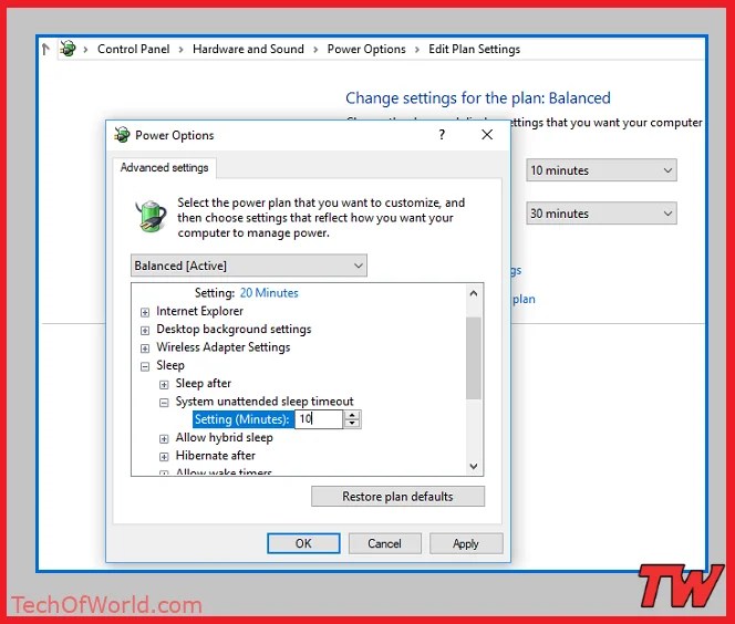 Available under Power Settings, the System unattended sleep timeout setting is the idle timeout before the system returns to low power sleep state. The default time is set to 2 minutes for both, i.e., when running on batteries and plugged. Change it to a higher value, so that the PC doesn’t get into Sleep mode too quickly.